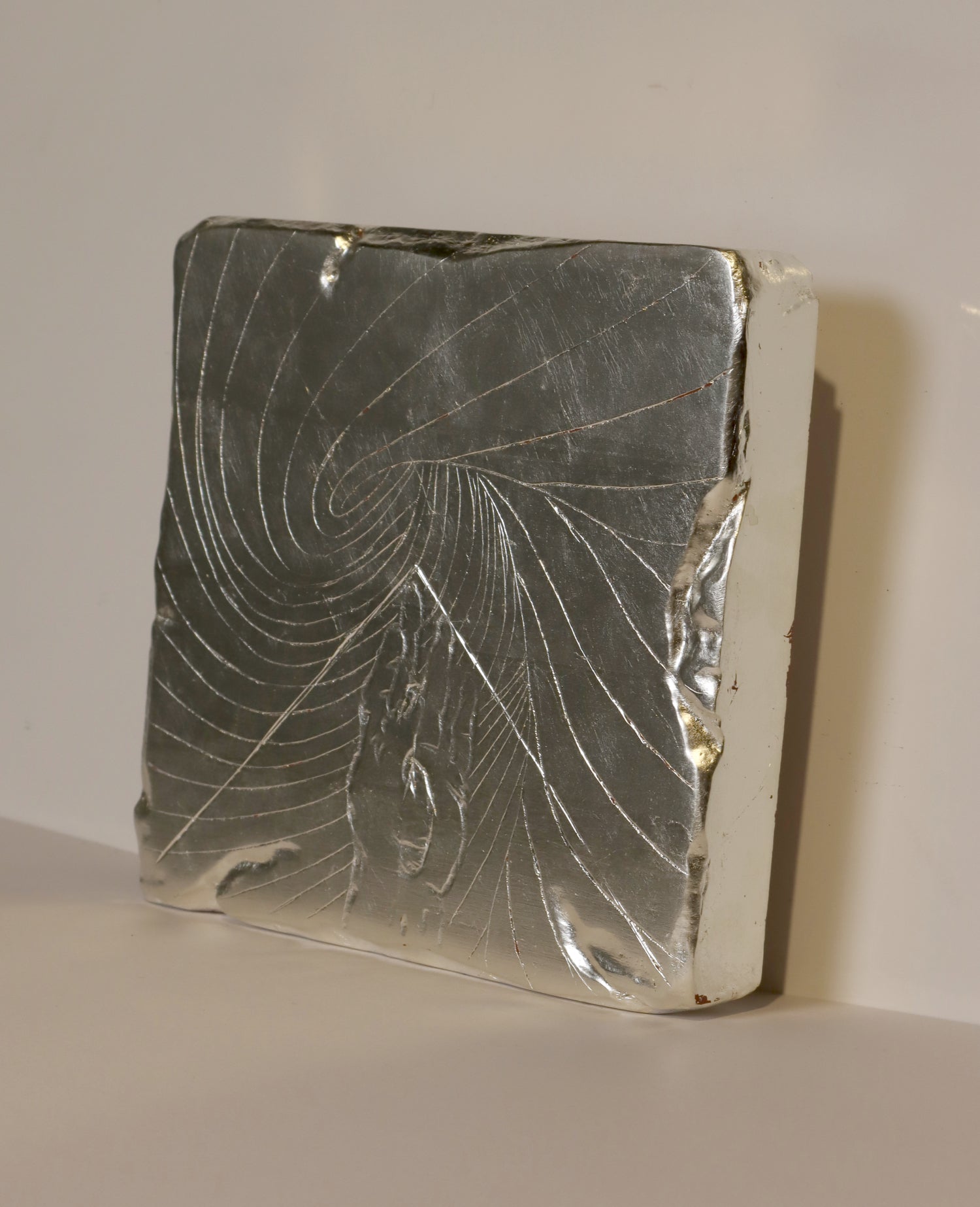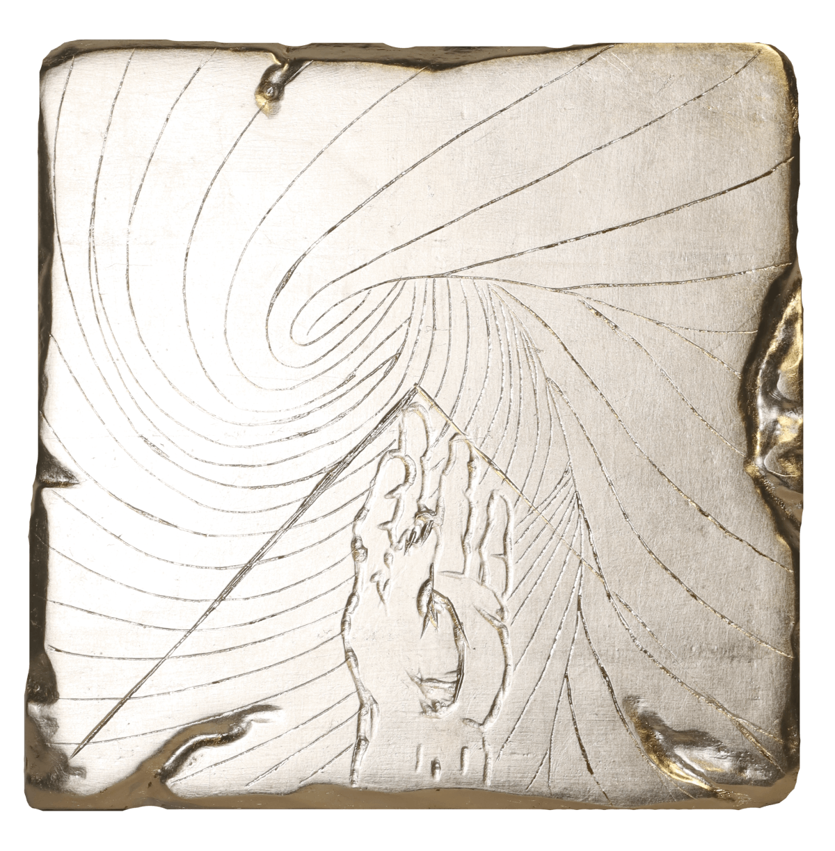 These smaller works focus on the hand of the Vitruvian figure as it reaches the edge of the square, the boundary of the physical world. Beyond this limit, the quantum field respond to its touch, symbolising the co-creative relationship between human awareness and the wider field of reality.