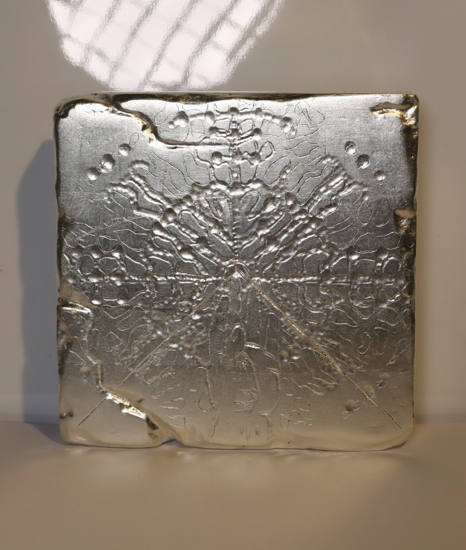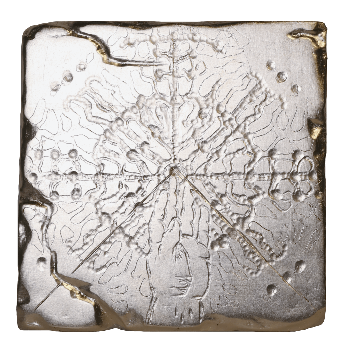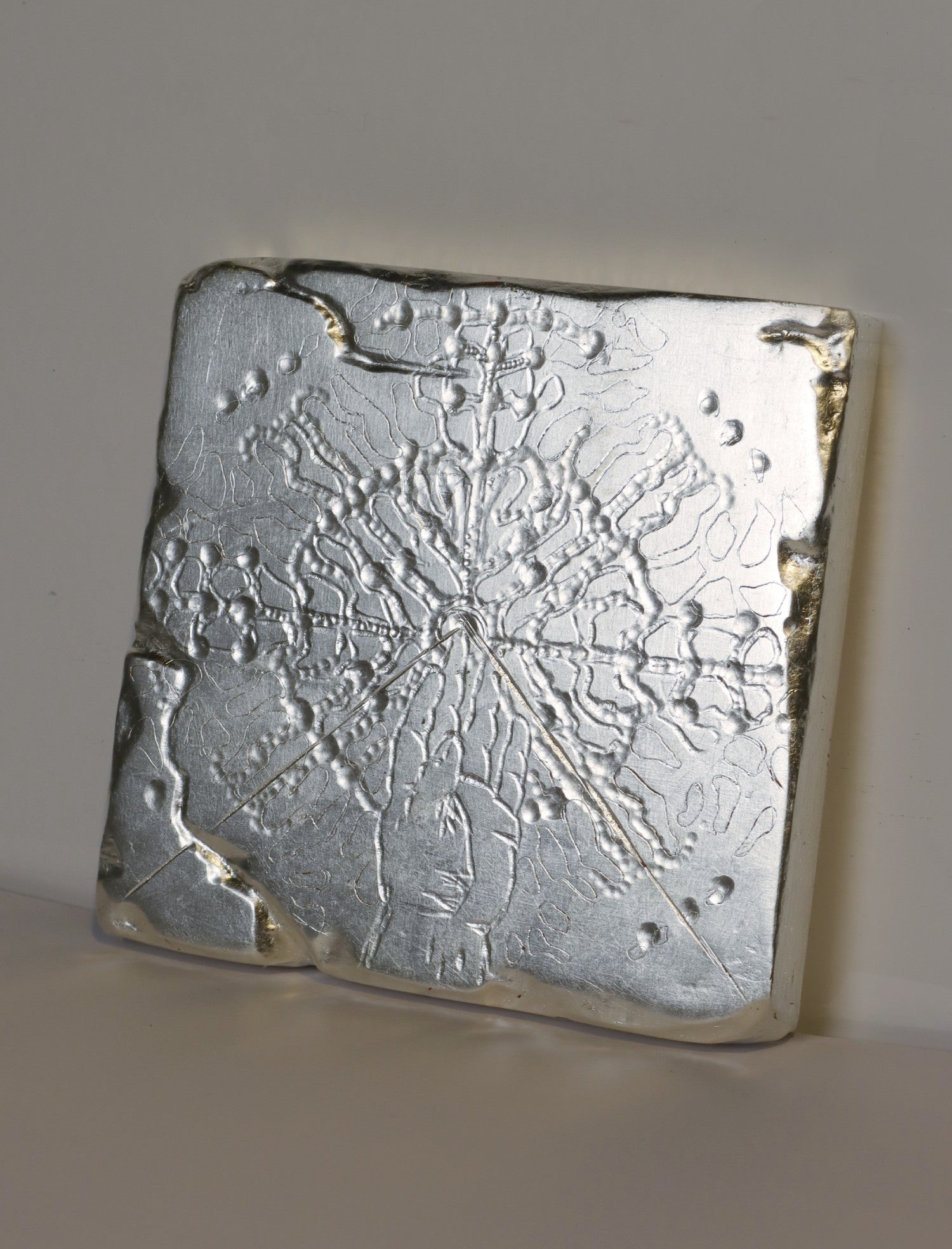 These smaller works focus on the hand of the Vitruvian figure as it reaches the edge of the square, the boundary of the physical world. Beyond this limit, the quantum field respond to its touch, symbolising the co-creative relationship between human awareness and the wider field of reality.